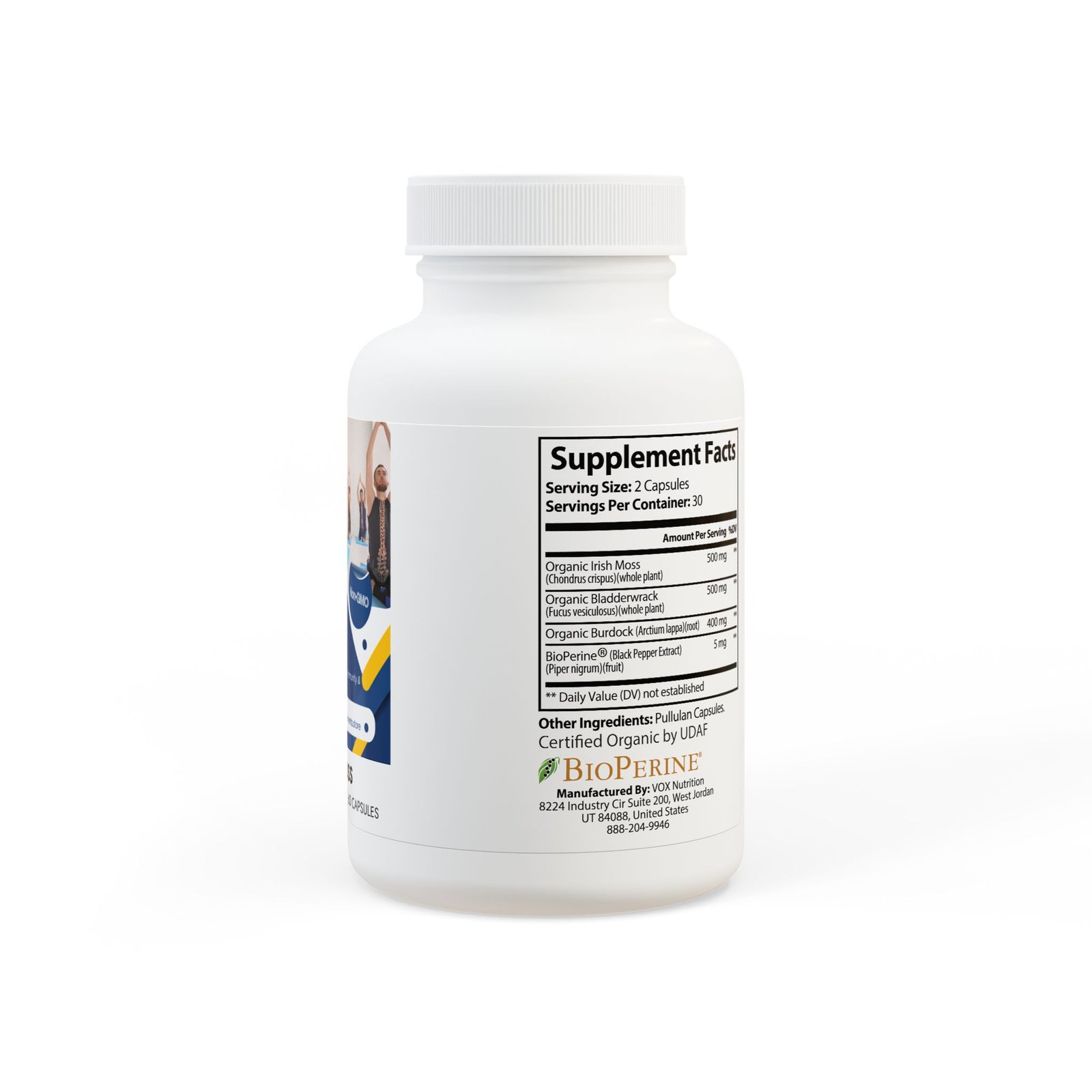 Ingredients: Organic Irish Moss (Chondrus crispus)(whole plant), Organic Burdock (Arctium lappa)(root), Organic Bladderwrack (Fucus vesiculosus)(whole plant), BioPerine® (Black Pepper Extract), (Piper nigrum)(fruit). Other Ingredients: Pullulan Capsules.