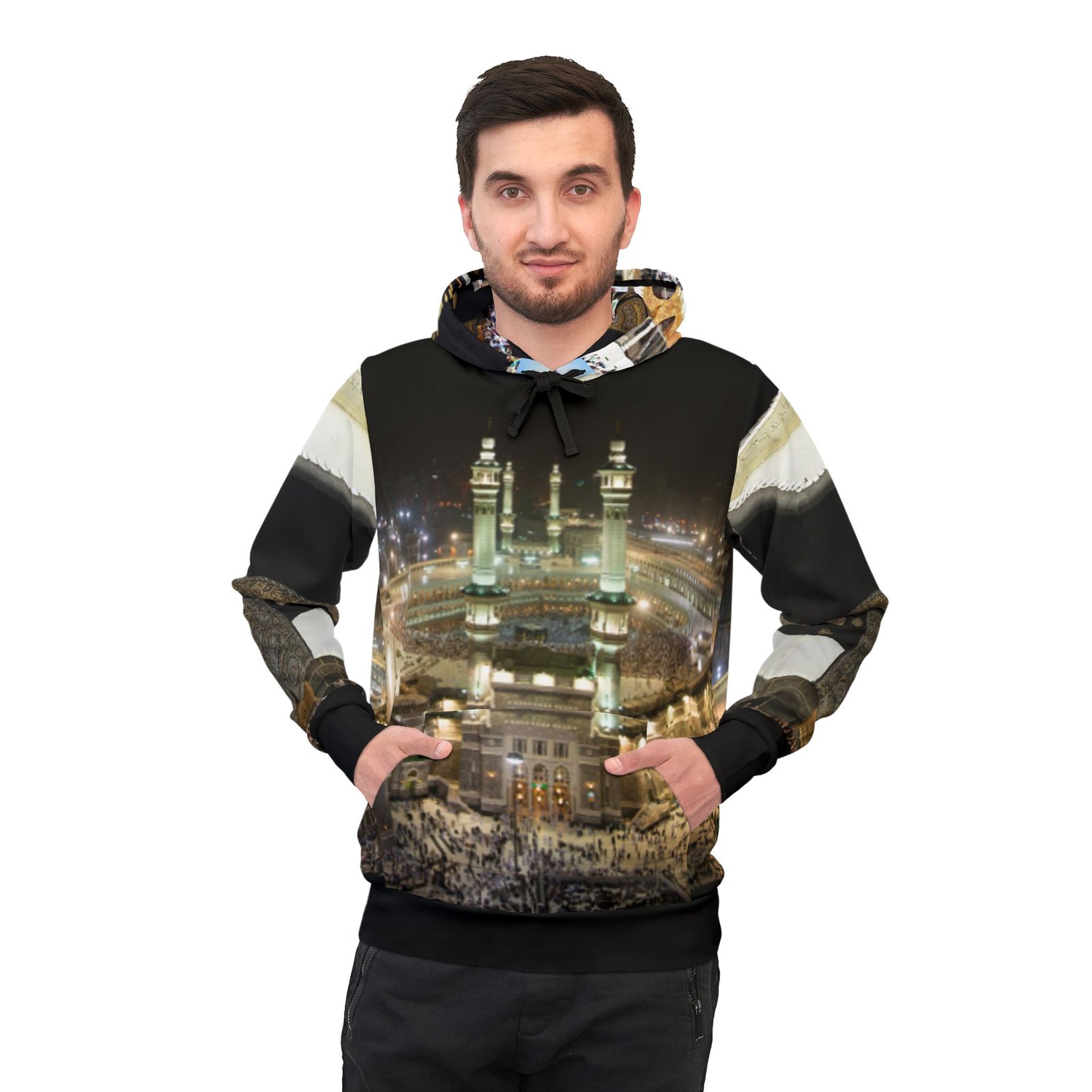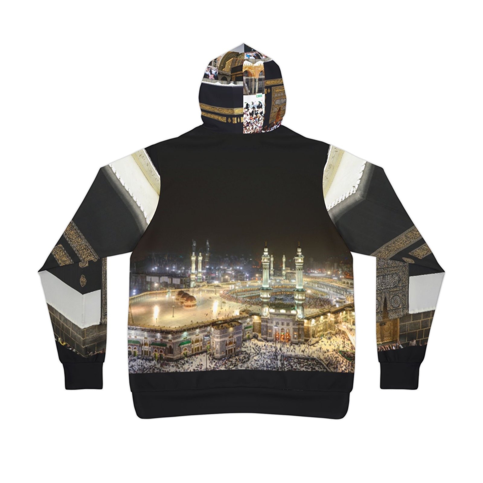 These unisex athletic hoodies come with a 95% recycled polyester and 5% spandex fabric blend that is as comfy in the gym as it is on a casual day out. Each hoodie comes with a flat black drawstring, a sewn-in size and care label, as well as a custom-printed label on the inside of the waistband. City Of Mecca Athletic Hoodie (AOP) | Muslim Hoodie | Eid Gift for Muslims | Muslim Athletic Wear | Islamic Clothes .: Material: 95% recycled polyester, 5% spandex .: Medium fabric (7.5 oz /yd² (250 g/m²)) .: Black drawstring .: Custom waistband label .: Sewn-in size and care label .: Seam thread color automatically matched to design