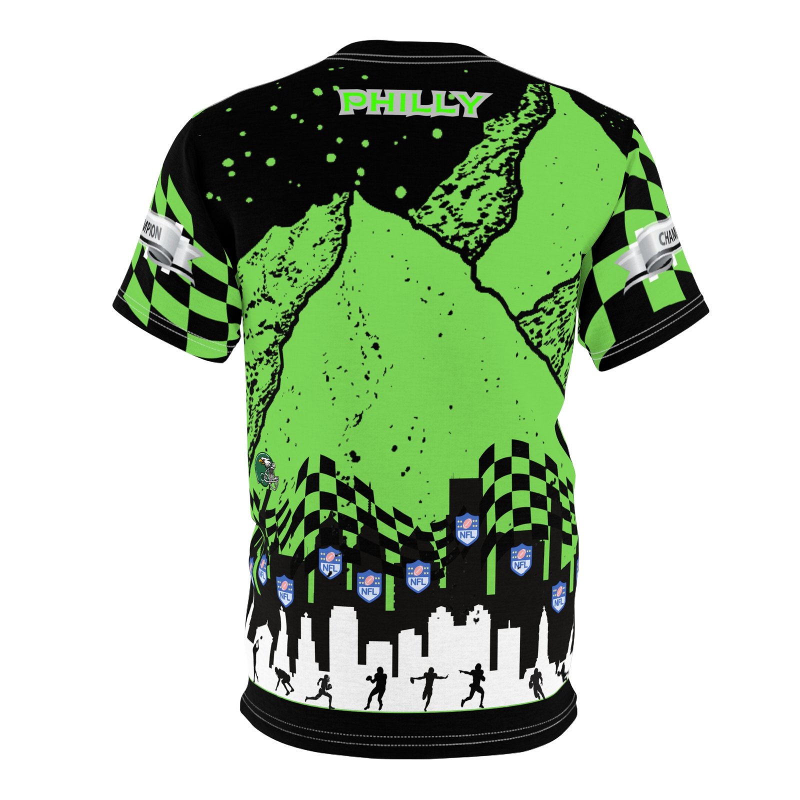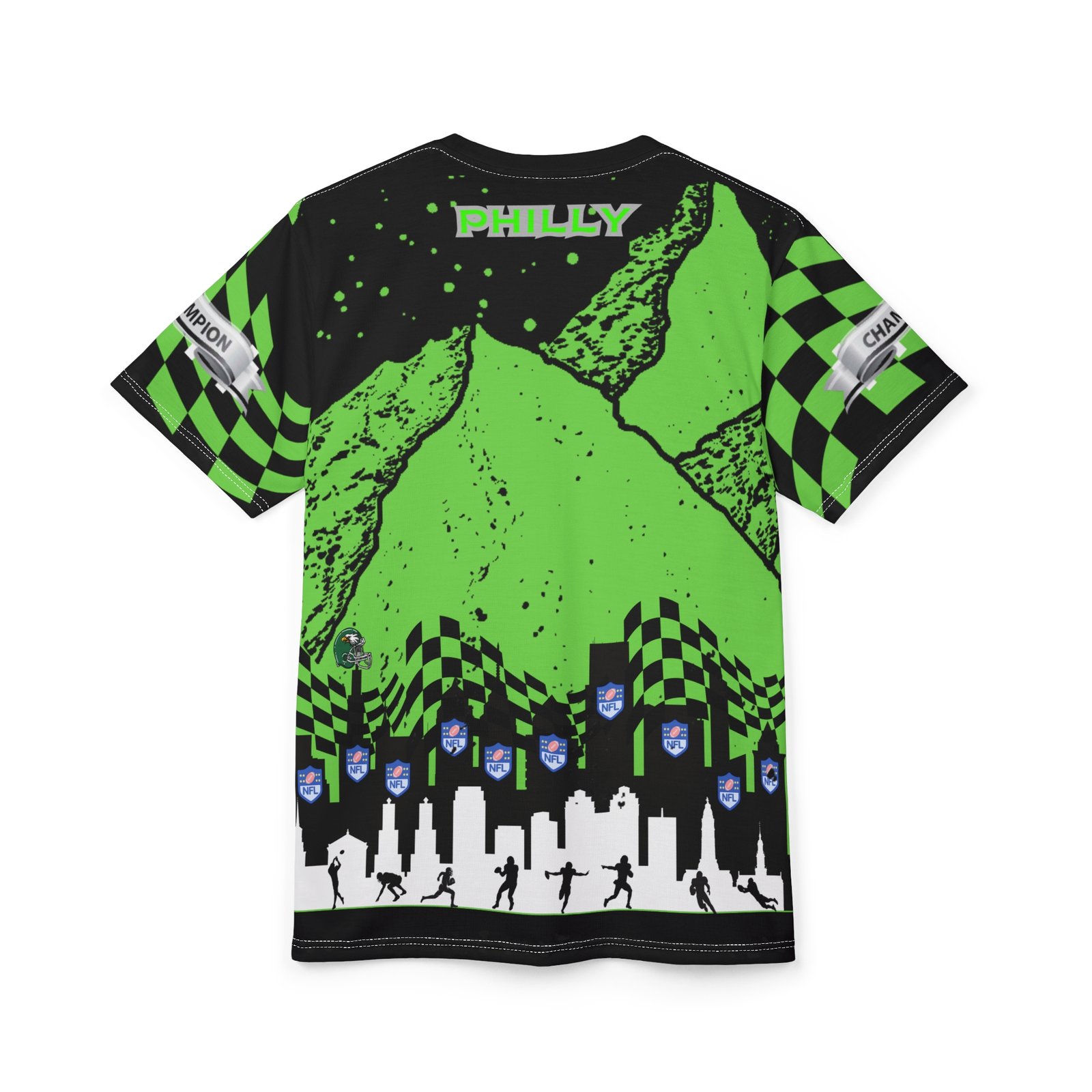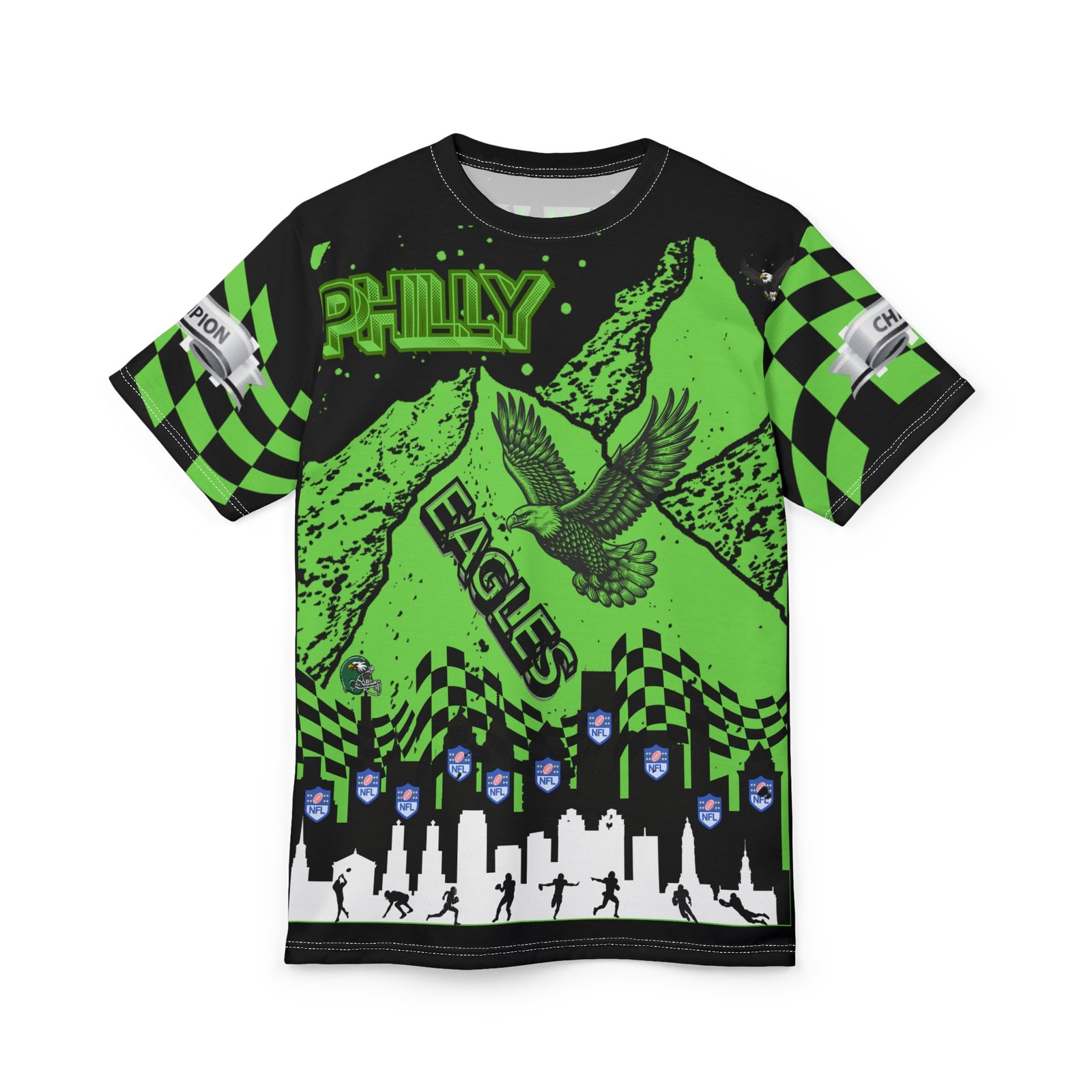 This Eagles Philly Graphic Tee Shirt is a must-have for Philadelphia sports fans. With its unisex design, it is perfect for both men and women who are proud supporters of the Eagles. This shirt is ideal for game days, sports events, tailgates, and casual wear. Product features – 100% Polyester fabric for durability and quick drying – Ribbed knit collar with seam for elasticity and shape retention – Shoulder tape for stability and prevention of stretching – Available in two fabric weights for preference – Tagless with a regular fit for comfort Care instructions – Do not dryclean – Do not iron – Tumble dry: low heat – Do not bleach – Machine wash: cold (max 30C or 90F), gentle cycle