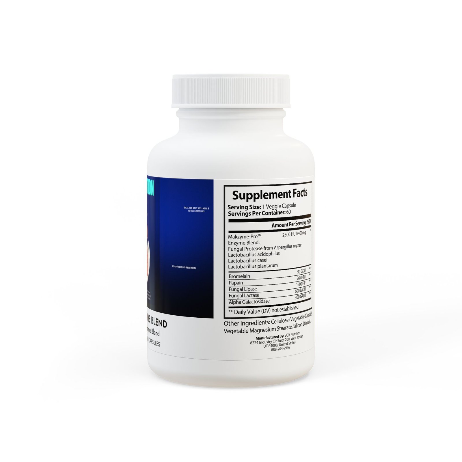 Key ingredients include Makzyme-Pro™, an enzyme blend featuring Fungal Protease from Aspergillus oryzae, Lactobacillus acidophilus, Lactobacillus casei, Lactobacillus plantarum, Bromelain, Papain, Fungal Lipase, Fungal Lactase, and Alpha Galactosidase.