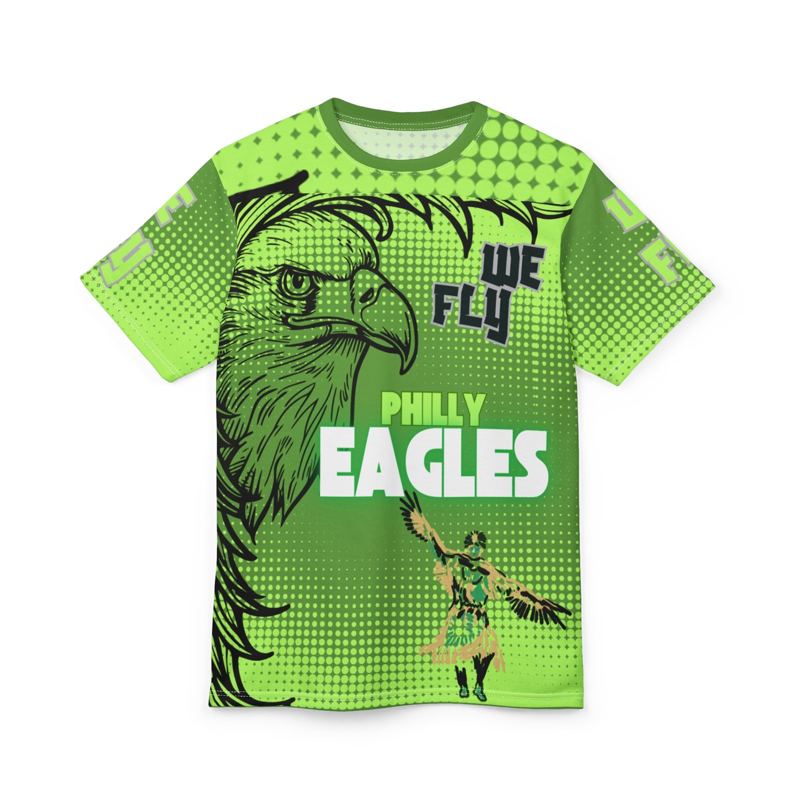 Introducing a vibrant, stylish We Fly Philly Eagles Unisex Tee Shirt, perfect for showing off your team spirit! This eye-catching We Fly Eagles Football Pride Unisex T-shirt features bold graphics that convey energy and enthusiasm, making it a great addition to any casual wardrobe. Ideal for Philadelphia sports enthusiasts, this Eagles T-Shirt is perfect for game days, tailgating parties, or just hanging out with friends. Its lightweight and breathable fabric ensures comfort throughout the day, making it suitable for summer events or casual outings. Celebrate your love for Philadelphia or brighten up your everyday style with this unique Eagles T-Shirt For Philadelphia Fans piece! Wear it during various occasions like birthdays, sports events, football games, or holiday gatherings, where making a statement is key. Product features – 100% Polyester for durability and quick-drying – Side seams for enhanced shape retention – Ribbed knit collar for elastic comfort – Shoulder tape for stabilization and support – Available in two fabric weights for preference Care instructions – Do not dryclean – Do not iron – Tumble dry: low heat – Do not bleach – Machine wash: cold (max 30C or 90F), gentle cycle