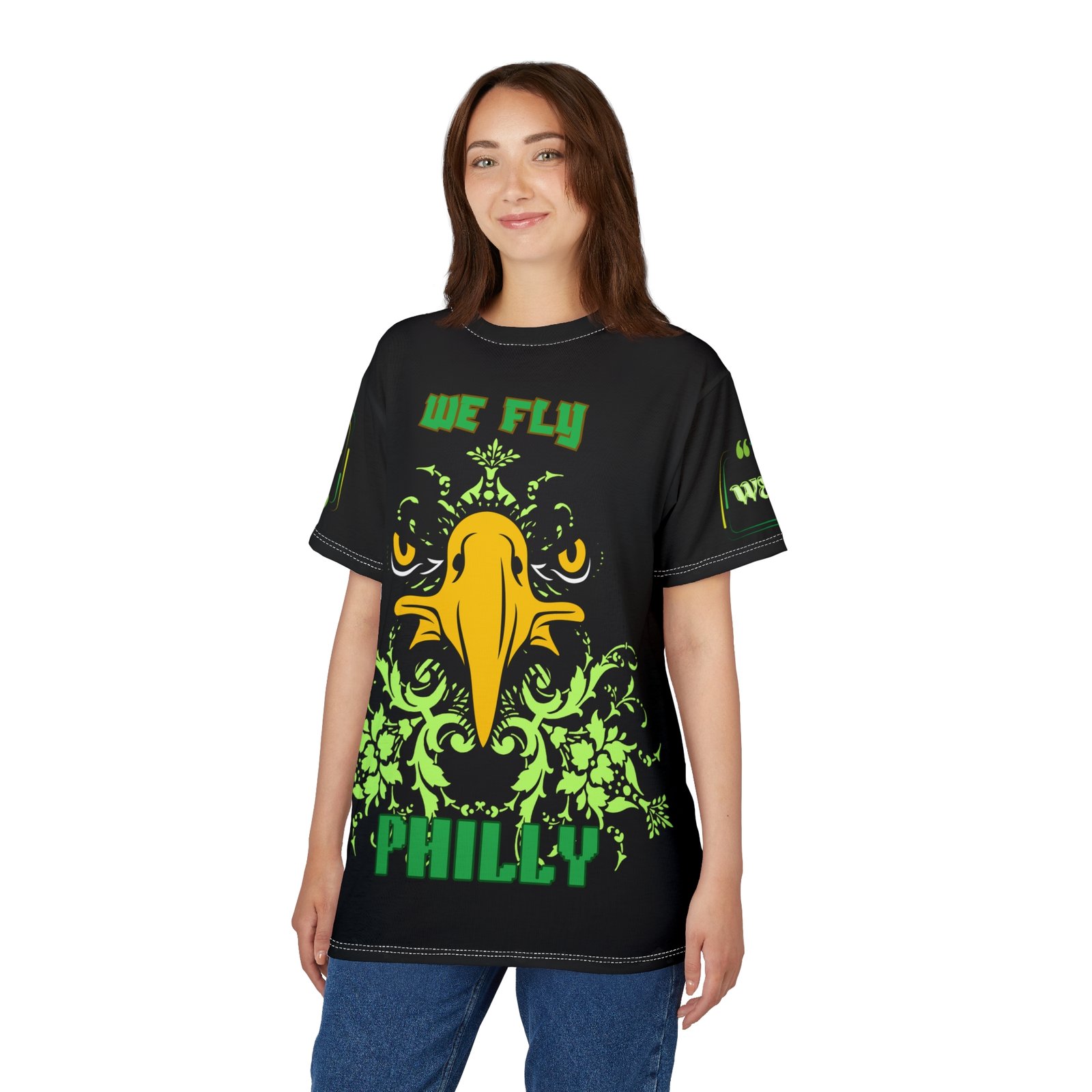 Introducing this vibrant We Fly Philly Graphic T-Shirt Unisex Tee that captures the essence of casual style of Philadelphia. With its bold graphics and lively colors, this Vibrant Unisex Philly T-Shirt is perfect for expressing your individuality and reprenting Philly culture. The lightweight polyester fabric ensures that you stay cool and dry, making it ideal for a day out or a relaxed evening. This We Fly Philly Jersey tee is designed for everyone who loves to stand out in a crowd. Whether you’re going to a sports event, hanging out with friends, or just lounging at home, it effortlessly fits into your lifestyle. Great for birthdays, casual celebrations, or just because—it’s a versatile addition to any wardrobe. This We Fly In Philadelphia Shirt is particularly relevant for people who love Philly, allowing you to show your pride in a stylish way. .: 100% Polyester .: Two choices of fabric weight ((4.0 oz/yd² (113 g/m²) and (6.0 oz/yd² (170 g/m²)) .: Regular fit .: Tagless .: Runs true to size .: Assembled in the USA from globally sourced parts